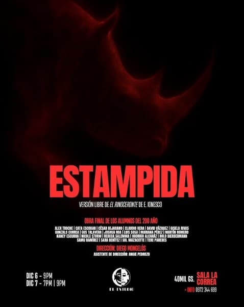 Por su parte, los egresados del segundo año presentarán “Estampida”, adaptación libre de El rinoceronte de Eugène Ionesco, dirigida por Diego Mongelós. Las funciones serán el sábado 6 de diciembre a las 21:00, y el domingo 7 a las 19:00 y 21:00, en la Sala La Correa. El elenco reúne a estudiantes de formación avanzada que afrontan repertorio del teatro del absurdo y reflexiones sobre la pérdida de la individualidad.