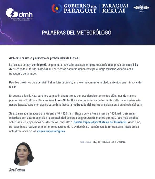 Este domingo 7 de diciembre se presenta con un ambiente marcado por el calor en gran parte del país. Las temperaturas máximas rondarán entre los 35 y 37 grados, mientras los vientos, que al inicio del día soplan desde el noreste, comenzarán a rotar hacia distintas direcciones durante la tarde. Este cambio favorece un clima caluroso e inestable.