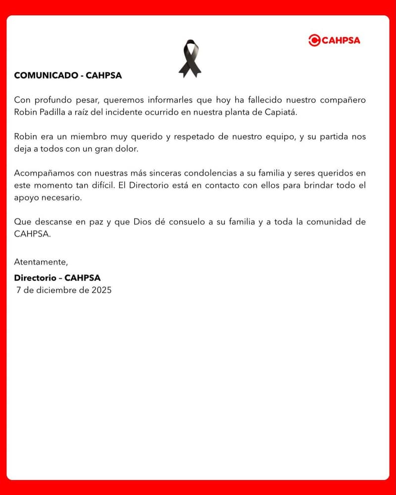 La empresa Cahpsa confirmó el fallecimiento de una segunda persona tras la explosión registrada el 30 de noviembre en su planta industrial de Capiatá. La nueva víctima fue identificada como Robin Padilla. La compañía expresó sus condolencias y reiteró su acompañamiento a los familiares, en medio de un ambiente de dolor que todavía no logra cerrarse.