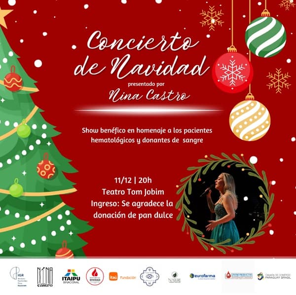 El Instituto Guimarães Rosa (IGR) de la Embajada de Brasil en Asunción anunció el Concierto de Navidad a cargo de la cantante brasileña Nina Castro. El evento se realizará el jueves 11 de diciembre, a las 20:00, en el Teatro Tom Jobim, ubicado en la intersección de la calle Eligio Ayala con Av. Perú. La actividad forma parte de la programación cultural anual del instituto.