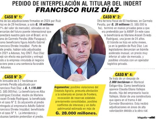Las adjudicaciones de terrenos fiscales en zonas estratégicas del Chaco —vendidos por montos extremadamente bajos y con presuntos vínculos políticos, empresariales e incluso del crimen organizado— colocaron al presidente del INDERT, Francisco Ruiz Díaz, al borde de una posible destitución. El Senado debatirá hoy su interpelación y podría recomendar su salida del cargo.