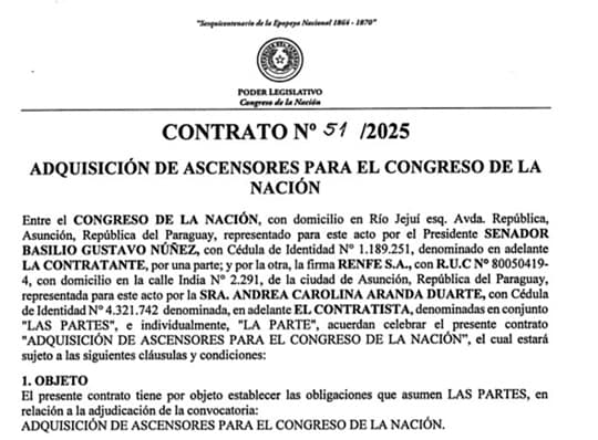 El Congreso Nacional adjudicó la provisión de siete ascensores por más de G. 3.300 millones a la empresa Renfe SA, pese a que su oferta no fue la más económica y a que la firma arrastra antecedentes administrativos y judiciales relevantes. La adjudicación fue resuelta el 20 de noviembre y el contrato se firmó ocho días después, según documentos oficiales.