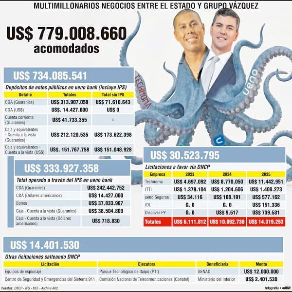 El Grupo Vázquez, liderado por Miguel Vázquez Villasanti, ha sido beneficiado con jugosos negocios públicos. Estos ascienden a más de USD 779 millones desde la llegada de Santiago Peña al poder. Las empresas del conglomerado son exsocias del presidente Peña en ueno Holding Saeca.