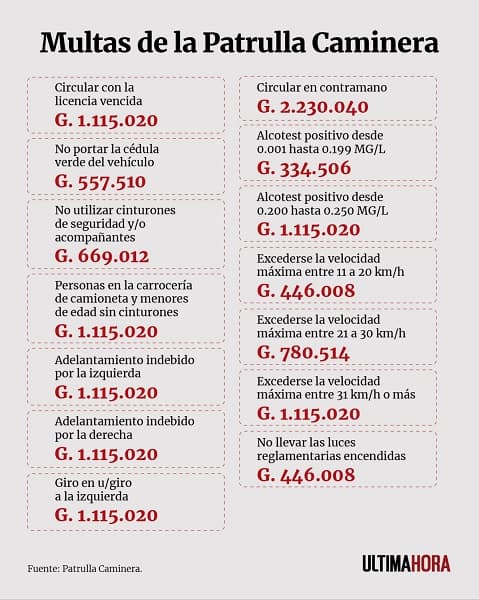 Según el esquema vigente, circular con la licencia vencida tiene una multa de G. 1.115.020. No portar la cédula verde implica una sanción de G. 557.510. No usar cinturón de seguridad, tanto el conductor como los acompañantes, se castiga con G. 669.012. En tanto, circular sin las luces encendidas tiene un costo de G. 446.008.