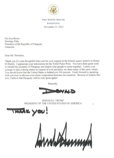En el texto, Trump agradece la “atenta carta” y el apoyo brindado en la “histórica cumbre de paz” en Sharm El Sheikh. Allí se menciona la firma de un cese del fuego entre Israel y Hamás en la Franja de Gaza. Además, el presidente estadounidense expresa aprecio por la nominación al Nobel. También destaca el trabajo de Peña en la economía paraguaya y su liderazgo político.