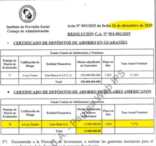 El Instituto de Previsión Social (IPS) volvió a quedar en el centro de la atención pública tras autorizar una nueva colocación de fondos en el banco ueno, entidad vinculada a exsocios del presidente de la República, Santiago Peña. La operación fue aprobada el 16 de diciembre por mayoría del Consejo de Administración y formalizada mediante la resolución CA Nº 093-001/2025.