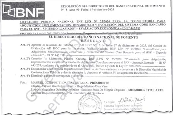 El informe técnico recomendó la cancelación del llamado público nacional LPN 25/2024. El proceso tenía como objeto la consultoría para la adquisición, implementación, desarrollo y evolución del sistema de core bancario del BNF.