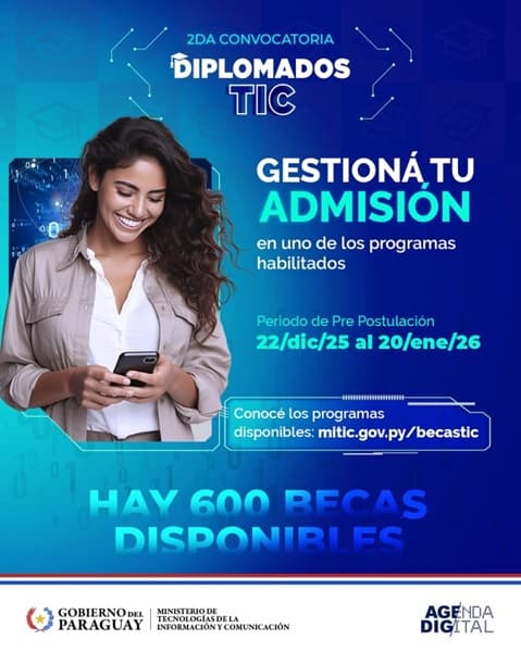 Finalmente, el MITIC recordó que solo podrán avanzar a la etapa de postulación quienes obtengan previamente la carta de admisión. Con esta convocatoria, la cartera tecnológica apunta a fortalecer el capital humano digital y acompañar el desarrollo de capacidades técnicas alineadas a la Agenda Digital del Paraguay.