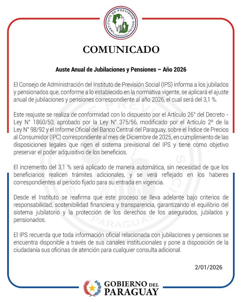 El Instituto de Previsión Social (IPS) anunció que a partir de este año, las jubilaciones y pensiones tendrán un aumento del 3,1%, de acuerdo con lo que establece la ley. Este ajuste se calculó usando el Índice de Precios al Consumidor (IPC) del mes de diciembre de 2025, y se aplicará automáticamente, sin que los beneficiarios tengan que hacer ningún trámite.