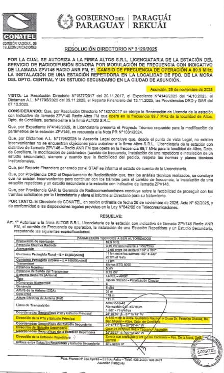 La irregularidad quedó asentada en la Resolución N.º 3129/2025 de Conatel, firmada el 26 de noviembre de 2025. El documento validó retroactivamente la modificación de frecuencia y la instalación de una estación repetidora en Fernando de la Mora.