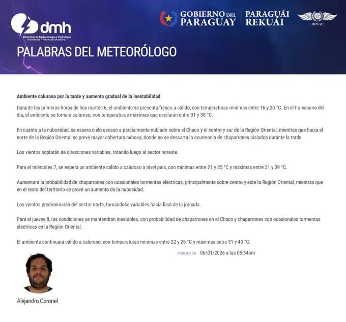 Para el miércoles 7, se mantendrá el calor, con mínimas entre 21 y 25 grados y máximas que podrían llegar hasta los 39 grados. También crecerá la posibilidad de chaparrones y tormentas eléctricas, especialmente en el centro y este de la Región Oriental. En el resto del país, se notará un aumento en la nubosidad. Los vientos seguirán viniendo del norte, aunque al final del día podrían cambiar nuevamente.
