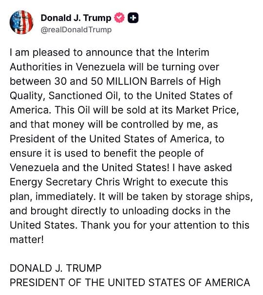 El anuncio fue realizado a través de su red social Truth Social. En su publicación, Trump sostuvo que el crudo será administrado por autoridades estadounidenses y que la operación busca generar beneficios tanto para el pueblo venezolano como para el estadounidense.