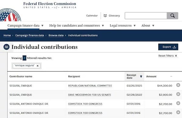 Enrique Segura figura como un donante constante en las campañas republicanas desde el año 2014. Según la Comisión Federal de Elecciones, el empresario aportó recientemente 44.300 dólares al Comité Nacional Republicano. Además, su firma Securiport destinó dos millones de dólares al comité Renew Virginia en 2023. Estos fondos impulsaron la campaña legislativa de su hijo, Juan Pablo Segura.