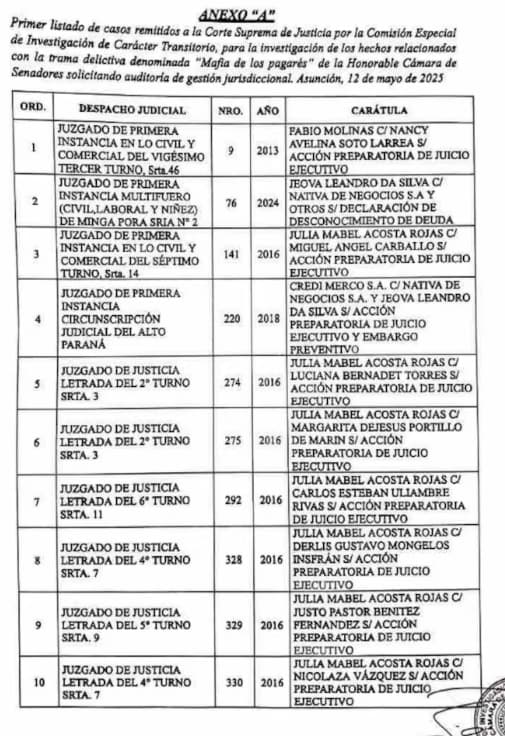 El listado de juzgados que se pidió auditar incluye tribunales de la capital, de Alto Paraná y un juzgado multifuero de Minga Porã, que tiene competencia en materias civil, laboral y de niñez. Muchos de los expedientes bajo la lupa corresponden a causas abiertas entre 2013 y 2024. Además, una parte de estos casos fue redistribuida tras una resolución que buscó agilizar los procesos de menor monto.