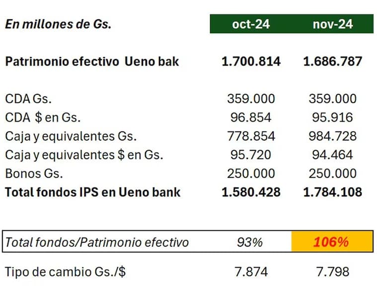 Con los depósitos realizados, la previsional entregó a Ueno más recursos de los que permite garantizar su patrimonio efectivo, indicó. Para sostener su planteamiento, presentó una recopilación basada en datos oficiales del Banco Central del Paraguay (BCP) y del propio IPS. De acuerdo con esos registros, en noviembre de 2024 la institución habría superado por primera vez un tope que, hasta entonces, todas las administraciones venían respetando.
