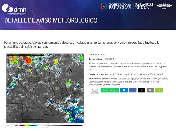 La Dirección de Meteorología e Hidrología (DMH) emitió un aviso especial este jueves por la tarde. El reporte alerta sobre el avance de núcleos de tormentas en nueve departamentos del país. Estos fenómenos se caracterizan por su desarrollo veloz y su paso rápido por las zonas afectadas. Sin embargo, los técnicos advierten que poseen un alto potencial de generar tiempo severo de forma muy puntual. La inestabilidad climática se mantendrá vigente durante las próximas horas de la jornada.