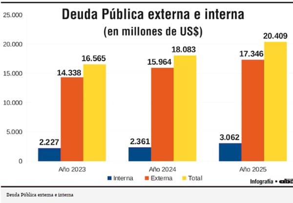 Dicho aumento equivale a una variación interanual del 12,8% respecto al año anterior. En aquel periodo, la deuda acumulada se situaba en USD 18.083,2 millones. Actualmente, el pasivo total del Estado representa el 41,2% del Producto Interno Bruto (PIB) nacional. La dinámica de endeudamiento refleja las necesidades financieras de la administración central y las entidades descentralizadas.