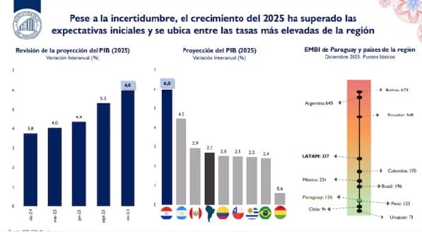 Finalmente, el BCP elevó la tasa de crecimiento económico del 5,3% al 6,0%. Gracias a esta actualización, el PIB cerró el año 2025 en USD 49.448 millones. Esta expansión económica permitió que el porcentaje final de la deuda fuera del 41,2%. Sin estos ajustes técnicos, la presión de la deuda sobre la economía habría sido superior.