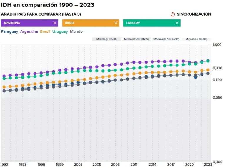 En el último dato disponible, Paraguay llegó a 0,756 en 2023, en línea con el promedio mundial (0,756). Argentina marcó 0,865, Uruguay 0,862 y Brasil 0,786. Entre 2022 y 2023, Paraguay subió +0,009, por encima del promedio mundial (+0,004), pero el informe insiste en la tarea pendiente: cerrar brechas internas.