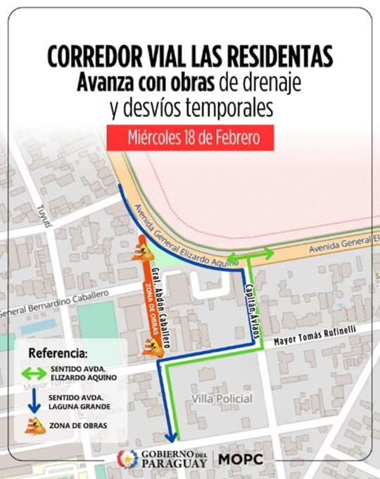 En el caso del tránsito con dirección a Laguna Grande, el desvío se realiza por Capitán Ávalos y continúa por calles internas hasta reincorporarse más adelante. Desde el MOPC pidieron circular con precaución y respetar la señalización instalada.