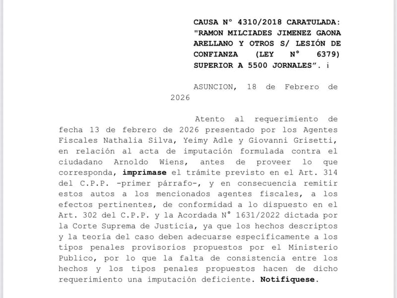 El juez penal de Garantías Osmar Legal devolvió la imputación presentada contra el exministro del MOPC, Arnoldo Wiens, en el marco del caso Metrobús. El magistrado consideró que el requerimiento fiscal es “deficiente”.