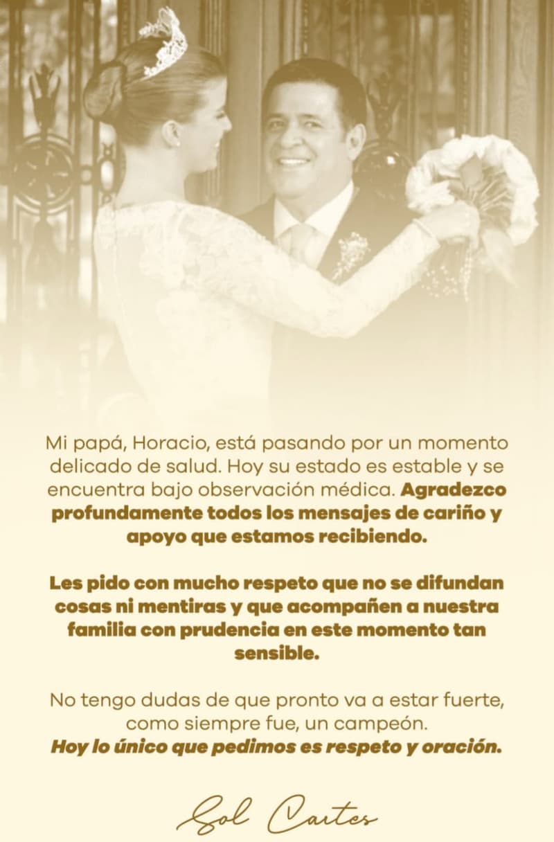 La hija menor del ex presidente Horacio Cartes difundió un mensaje público tras la internación de su padre. El ex mandatario ingresó a un sanatorio luego de convulsionar por un cuadro hipertensivo. Actualmente permanece en terapia intensiva, intubado y con parámetros estables.