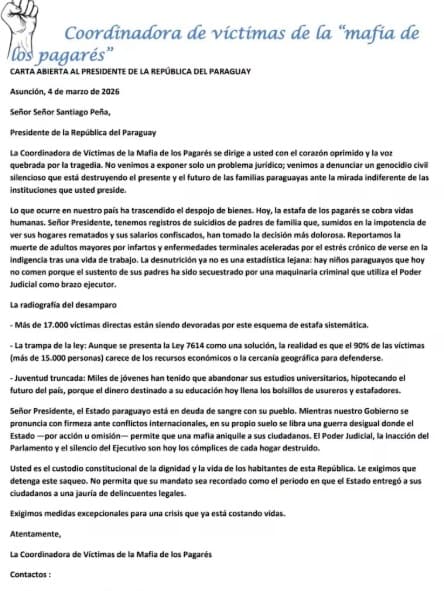 La Coordinadora de víctimas de la denominada “mafia de los pagarés” envió una carta abierta al presidente de la República, Santiago Peña. El documento fue difundido ayer y expone una serie de denuncias sobre el impacto social del esquema de estafas denunciado por los afectados.