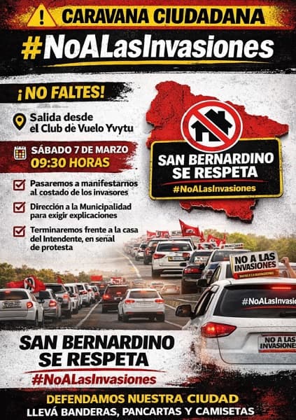 Como medida de fuerza, los ciudadanos convocaron a una caravana para el día de mañana sábado a las 9:30. La movilización busca defender la integridad de la ciudad y exigir el cese de las invasiones patrocinadas. El conflicto pone a prueba la capacidad del sistema judicial para proteger la propiedad privada frente a intereses partidarios. Los vecinos aseguran que no retrocederán hasta garantizar el orden en su comunidad.