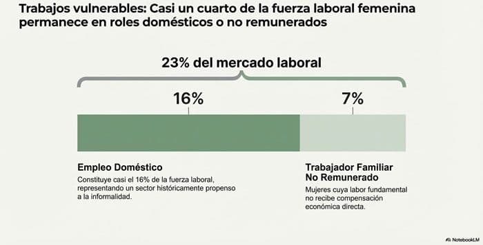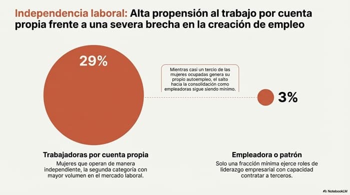 Al analizar las categorías de empleo, se observa una alta concentración en el sector privado. El 31% de las mujeres ocupadas se desempeña como empleada u obrera de empresas. Por otro lado, las trabajadoras por cuenta propia representan el 29% de la fuerza laboral. Estas cifras evidencian la importancia del emprendimiento y la gestión autónoma para ellas.