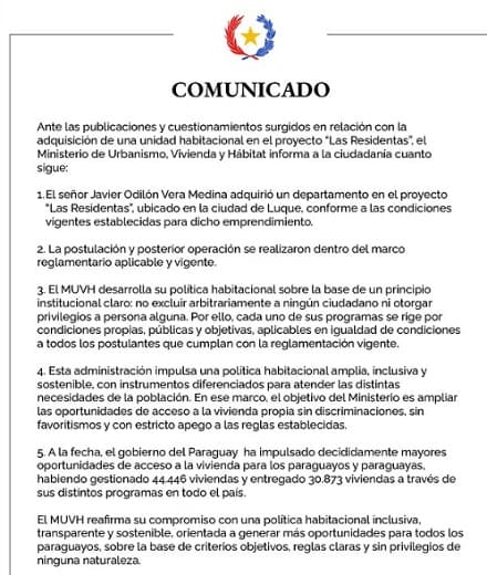 El Ministerio de Urbanismo, Vivienda y Hábitat emitió un comunicado tras las críticas surgidas en torno a la adjudicación. En el documento, la institución informó que el senador Javier Odilón Vera Medina adquirió el departamento conforme a las condiciones vigentes del proyecto.