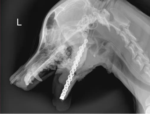 Debido a la gravedad del daño, los especialistas realizaron una mandibulectomía. Posteriormente, el equipo veterinario logró colocar la prótesis mandibular que permitió devolverle funcionalidad a la zona afectada.