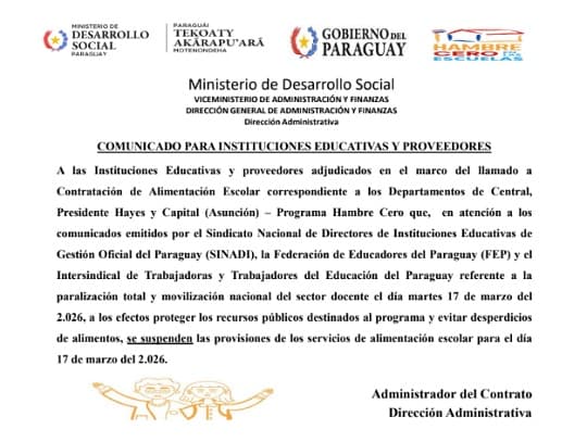 La jornada de paro también tendrá impacto en el programa de alimentación escolar. El Ministerio de Desarrollo Social comunicó la suspensión del servicio correspondiente al programa Hambre Cero.