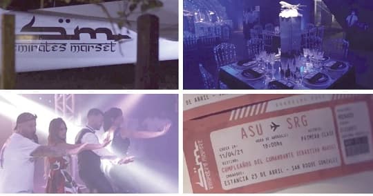 Las imágenes revelan una celebración con una escenografía inspirada en un aeropuerto. La entrada al evento simulaba una pista de aterrizaje y contaba con una avioneta que llevaba el nombre “Emirates Marset”.