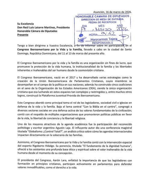 El informe remitido el 17 de marzo describe el congreso como una iniciativa orientada a la defensa de la familia y la vida. Además, menciona proyectos como la Unión Iberoamericana de Parlamentos Cristianos.
