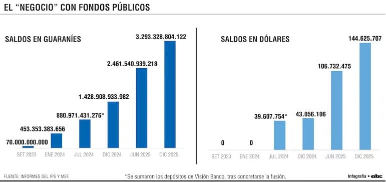 Tras la aprobación de la fusión en junio de 2024, los montos siguieron en ascenso. Para julio, ueno concentraba USD 39,6 millones y G. 880.971 millones. Luego, en diciembre de ese año, ya custodiaba G. 1,4 billones, de los cuales G. 1,3 billones correspondían al IPS, además de US$ 43 millones.