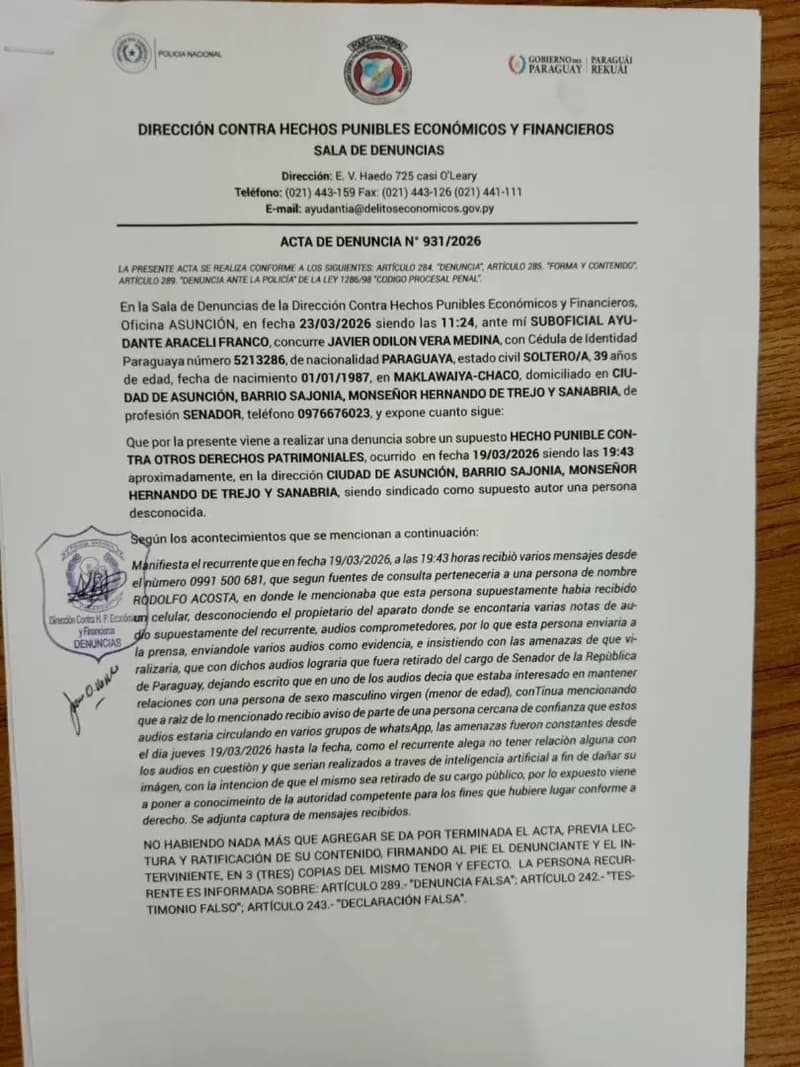 El senador Javier Vera, alias “Chaqueñito”, denunció ante la Policía Nacional un supuesto intento de extorsión. Según su presentación, desconocidos buscan perjudicarlo mediante audios atribuidos a su voz. El caso ya está en manos de la Dirección Contra Hechos Punibles Económicos y Financieros.