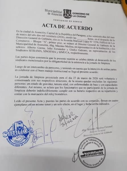 El acta también aclara que varios sectores quedan excluidos de cualquier actividad operativa en las calles. Las personas embarazadas, adultos mayores y funcionarios con enfermedades de base no serán convocados. Tampoco participarán aquellos con capacidades diferentes. Quienes no se sumen a la limpieza deberán cumplir su horario habitual en sus oficinas. El control se realizará mediante la marcación obligatoria del reloj biométrico.