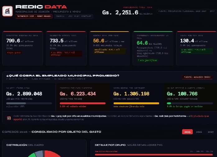La Red de Indignación Ciudadana (REDIC) habilitó REDIC Data, el primer tablero de control ciudadano diseñado para auditar la gestión financiera municipal. Esta herramienta tecnológica permite visualizar el presupuesto de la Municipalidad de Asunción para el año 2026, utilizando datos oficiales del INE y el Ministerio de Economía.