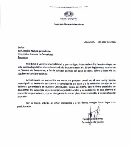 En conferencia de prensa, el titular del Senado afirmó: “La bancada de Honor Colorado se reunió y aceptó un pedido de permiso del colega David Rivas que está presentando”. También indicó que la medida permitirá que el senador se someta al proceso judicial correspondiente.